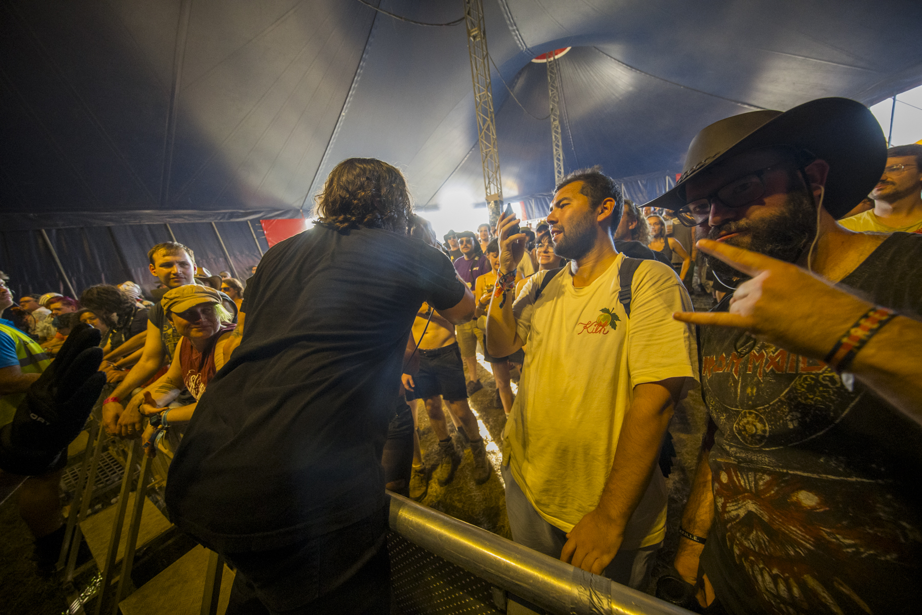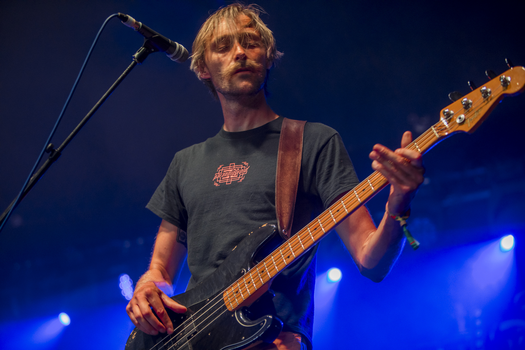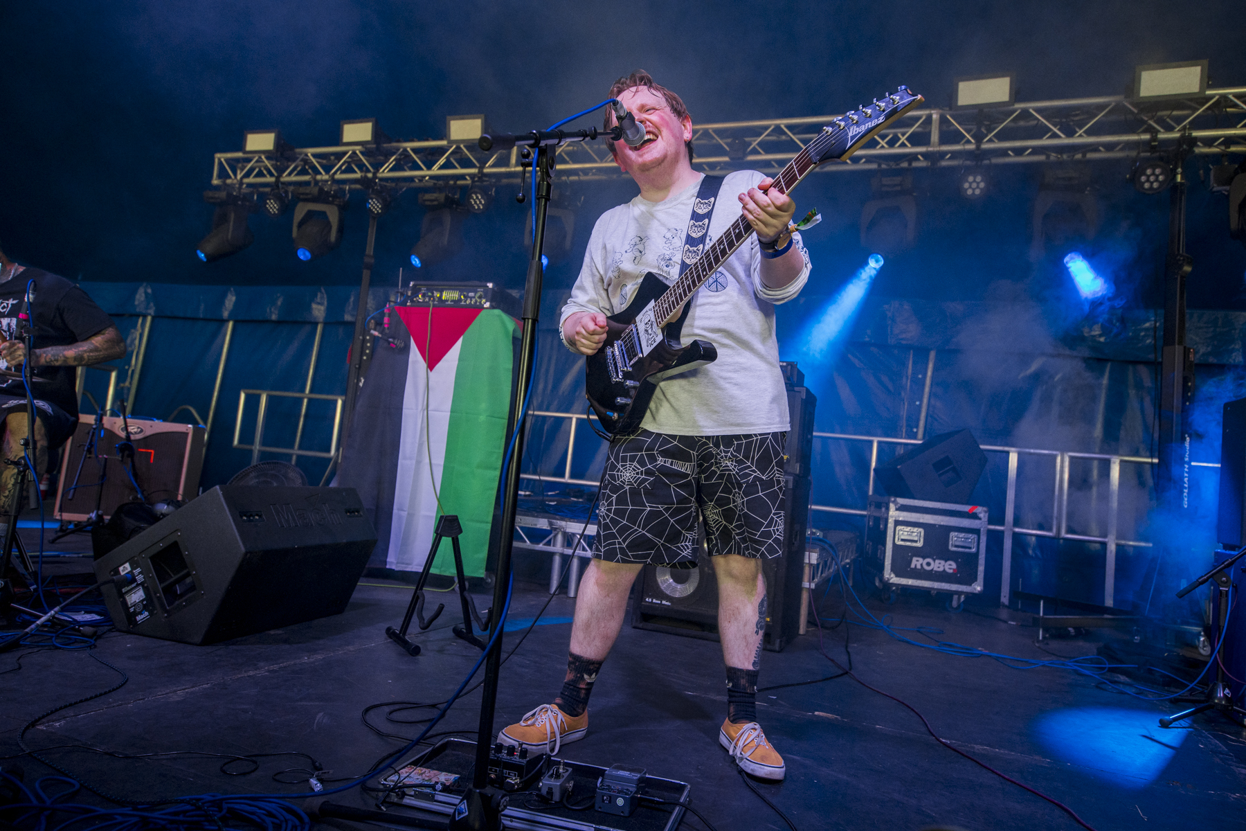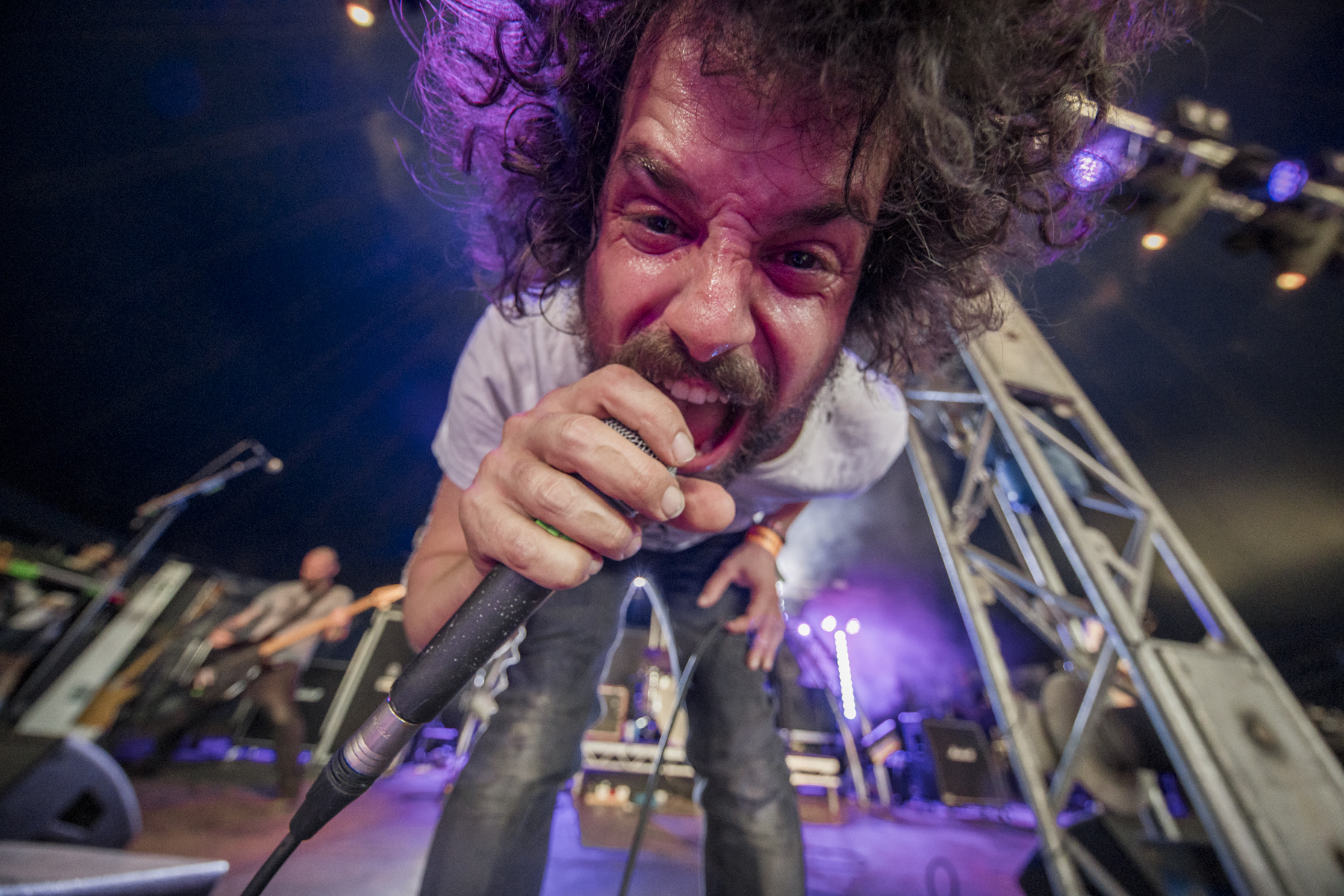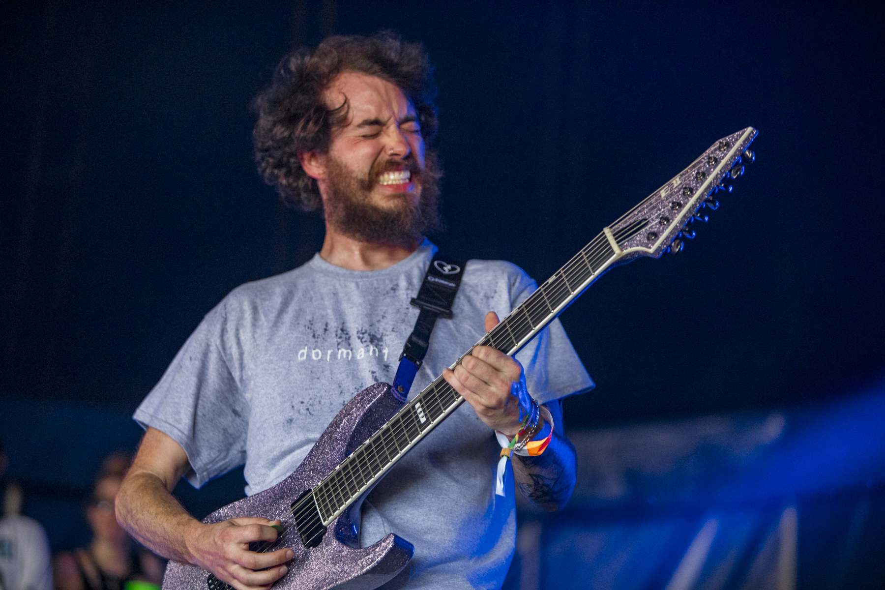 Frontierer are easily the most brutal band I’ve caught all weekend. It’s a constant attack on the senses; musically, guitars chug before pitch shifting up a couple of octaves to create sections that just dive between low and high. All the while, the lighting is perfectly synchronised, strobing violently while everyone moves around the stage, guitars thrown around. The drums alternate between blast beats and technical sections, and the vocals, well, they’re the brutal cherry on the cake. I’ve seen them a few times at ArcTanGent, which is usually a full tent with a ton of crowd surfing, but this is their first Trees, and the crowd is a little more cautious, standing a bit further back while the mosh pit spins kicks and swings arms. Halfway through the set, Dan climbs the tent support beam up to the lighting truss, taking his guitar with him – it’s good that even with a slightly calmer audience, the band give it their all.