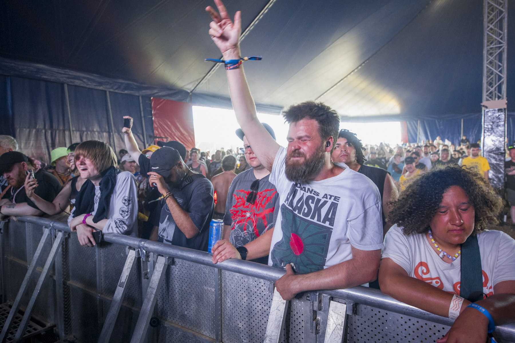 Kicking off the morning (relative morning, it’s 1 pm), mathcore party band Kaonashi, from Philadelphia, are doing a great job at making everyone in the tent sweat from every pore. Filthy riffs and nasty drums provide the backing to the assault of screams, high-pitched yelps and fast-paced vocals, interlaced with moments that confuse and, dare I say, add a bit of fun to proceedings. An acappella verse from Radiohead’s Creep is quite jarring when it’s placed in the breakdown of an otherwise assault of guitar, bass and drums. Most of the samples seem out of place, but it works. As good a wake-up as coffee.