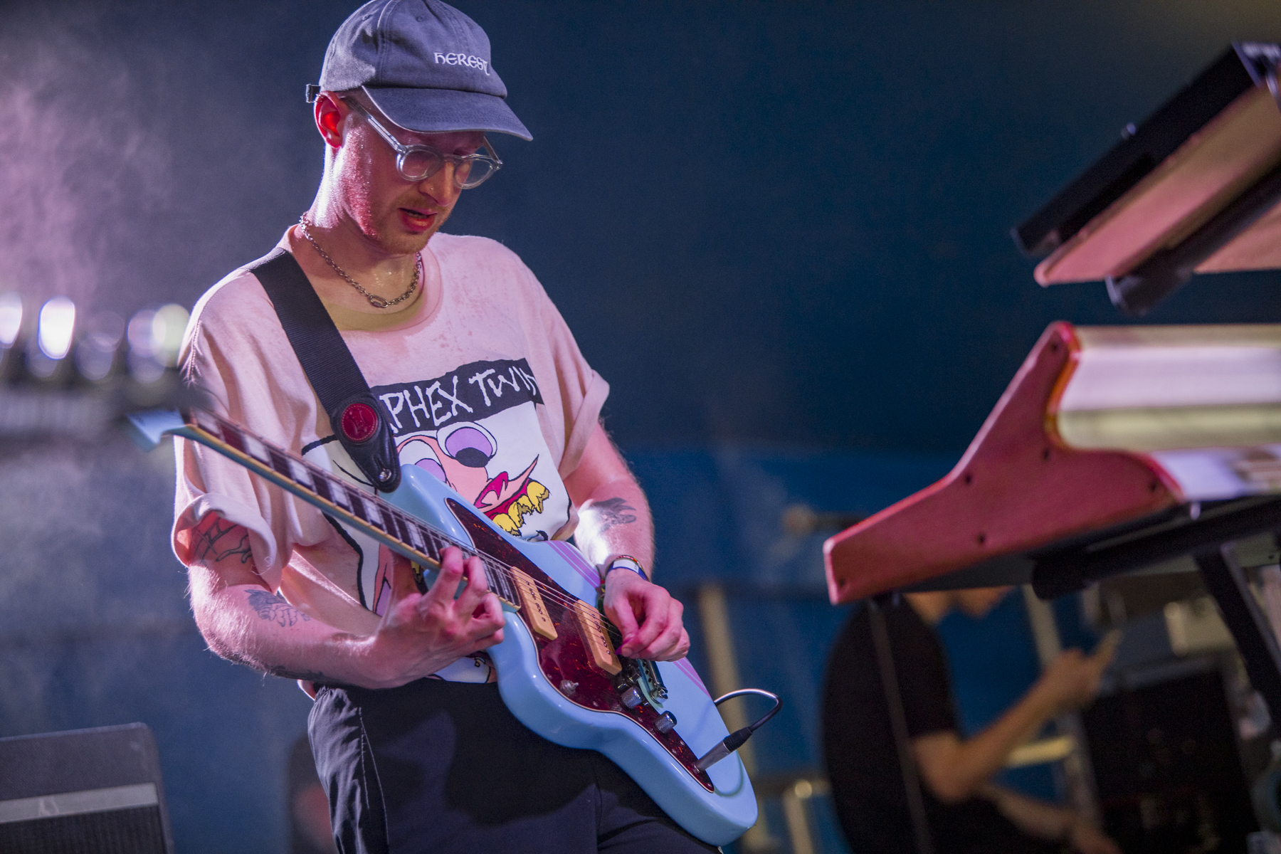 Musically, KEG and Kaonashi have very little in common, but where the two bands do line up is in how much fun they are. The way all of KEG’s instruments play off of each other is immensely enjoyable, the seven members spread between three guitars, bass, drums, two synths, trombone and vocals. Vocally I think Talking Heads would be a fair comparison, a lot of shouted vocals and interesting themes. A lot of their music is very bass-driven, the guitars often adding dissonance and light lead parts. A few songs have an odd pitch-changing effect on the vocals, with the guitars playing an erratic mixture of chorus-soaked high parts and weird-sounding stabs. They wrap up their set with the excellent single Kids and it’s amusing lyrics about children being shitty and wanting itsu; good sound, funny lyrics, what more could you want?