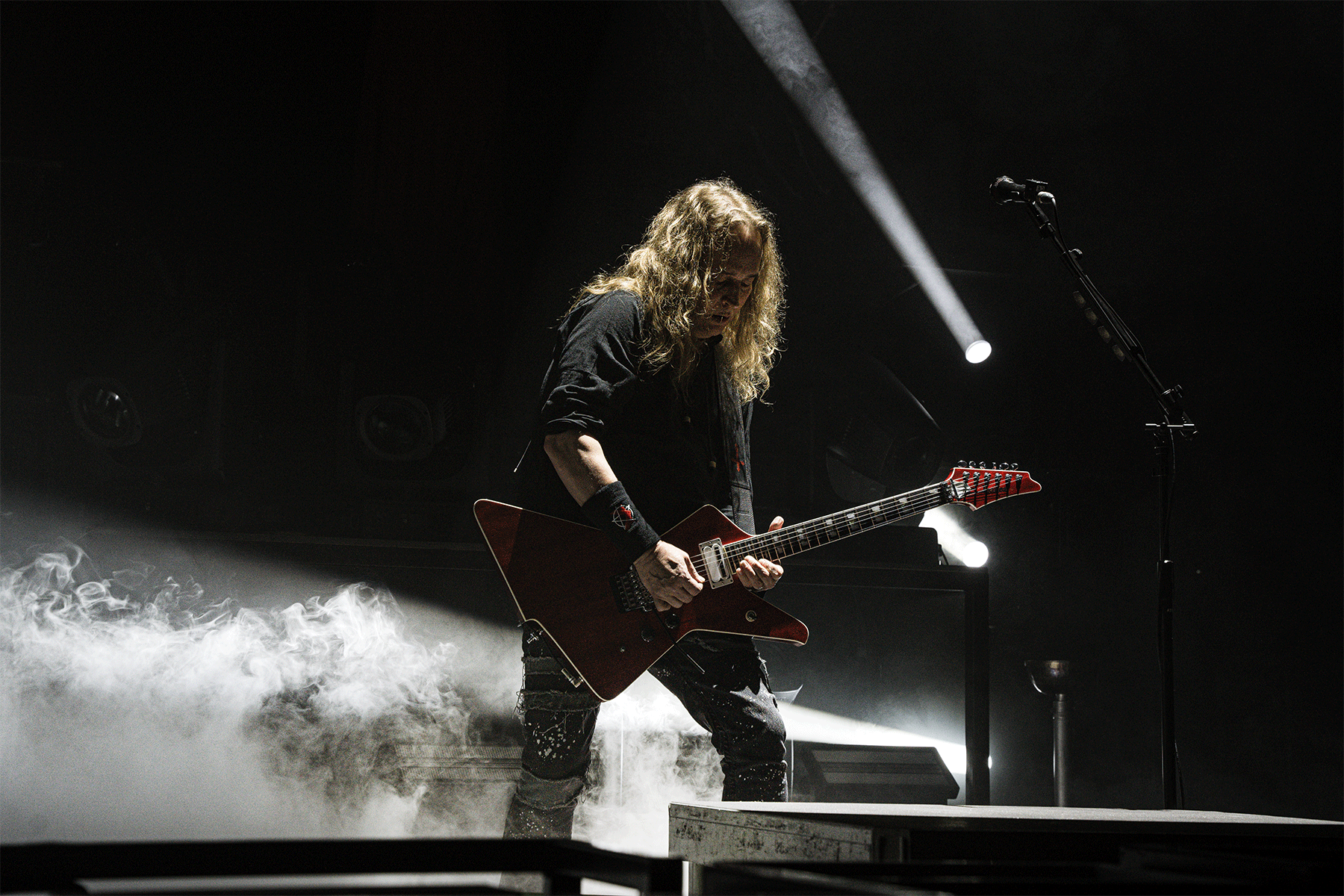 Testament is such a monumental band that it’s rude to call them a warm-up act. Their entrance, following the unmistakable sound of the Beastie Boys, kicked the night off beautifully—everyone was more than ready to party. From the first song, pyro effects paired with stunning light designs amplified every riff and breakdown. The sound was fast, stirring the entire venue into motion. It took a few songs to get people moshing hard, but by the seventh track, beers were downed, and the pits raged. Testament’s 11-song setlist was packed with their biggest hits, spanning from their classic ’80s albums to some more recent releases with heavy hitters like “Into the Pit”, “D.N.R.”, and my personal favourite, “Low”—which was released the same year I was born. “Return to Serenity”, their beautiful ballad and the only one of the night, which returned to their set after almost 30 years, hit the spot, filling my ‘90s metal ballad cup. I love a slower song at a thrash concert—it gives you a chance to catch your breath between moshpits, share a quick hug with your mates, and gear up for more shoving and chaos. No Testament show is complete without Alex Skolnick’s delicious guitar solos and I’d bet good money that most people at the Apollo have at least once tried to air-guitar those in their lives.