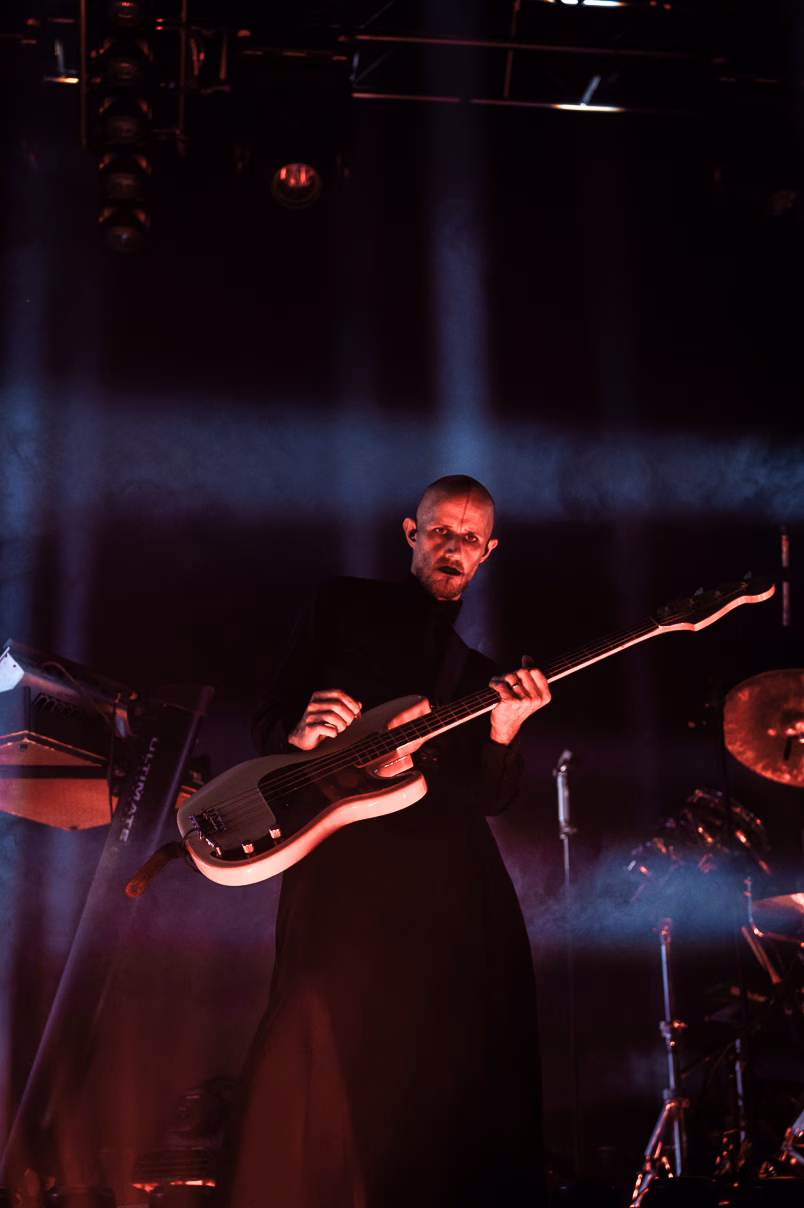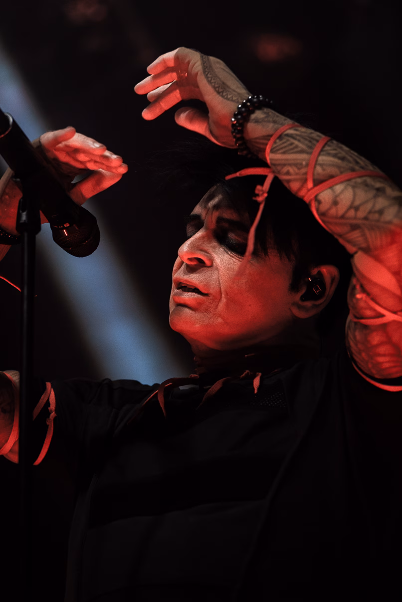 Eventually the time has come to celebrate the 45th anniversary of Telekon, Gary Numan’s sophomore solo album that debuted at number one of the UK charts back in September 1980. Gary Numan and his band emerged onto the Apollo stage, transformed for the night into three platforms. Each step had rows of lights that would perfectly control the mood, and often form a dystopian grid framing the musicians between the beams. Numan took to the microphone in his trademark black outfit with arms bound with red ribbons, and with endless charisma began weaving through the Telekon tracks, just as relevant today as they were forty five years ago, proven by the frequent chants “NUUUUUMAAAAAN” from various pockets of the five thousand strong audience.