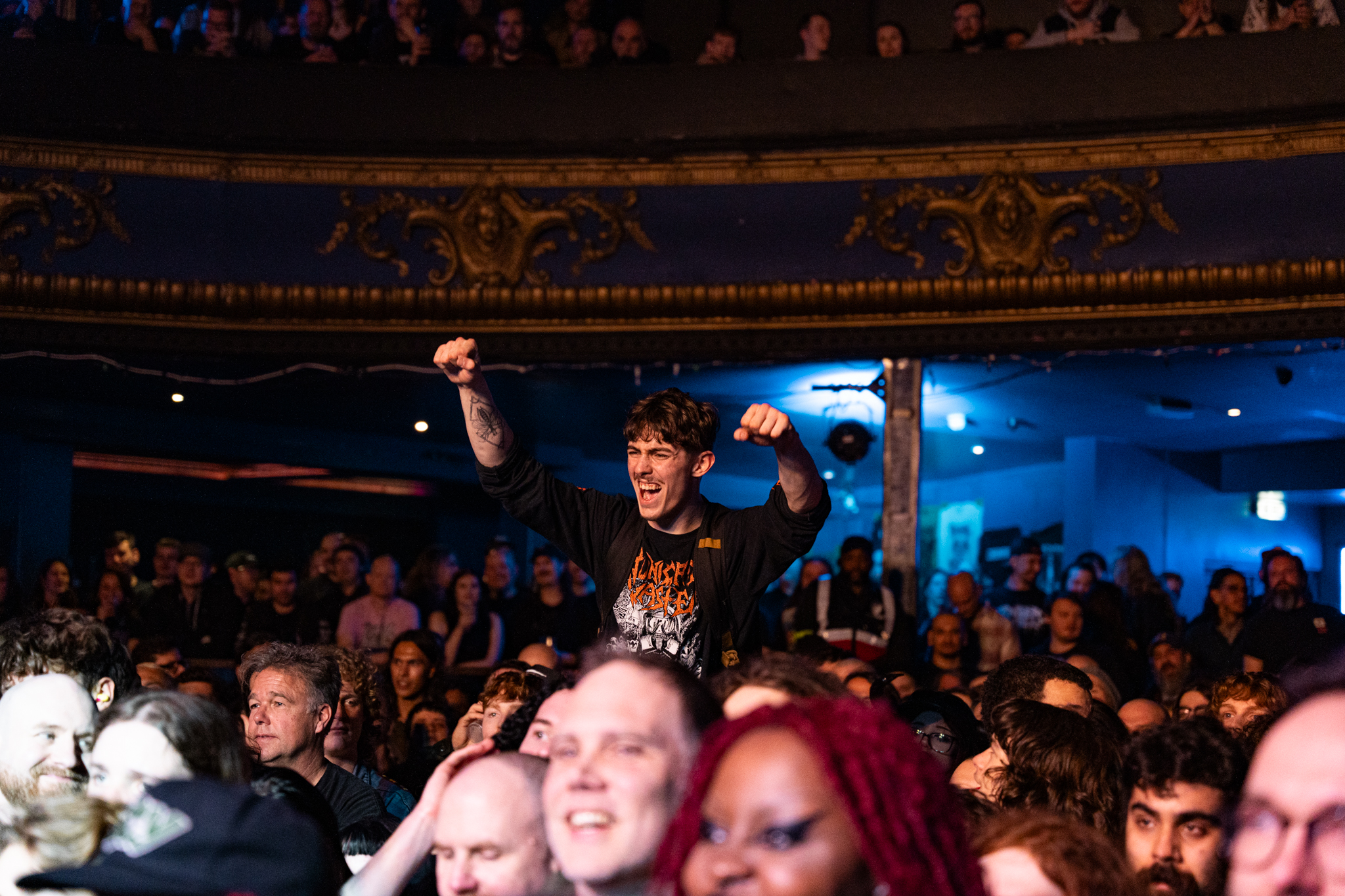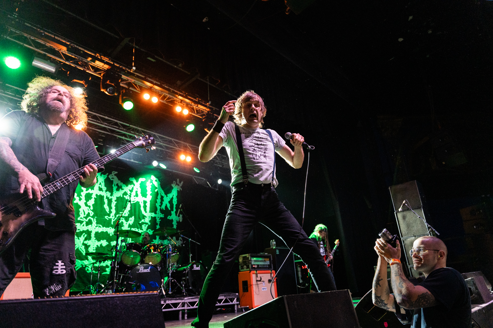 Next up was Napalm Death! They took to the stage at Electric Brixton with an intense opening performance of “Multinational Corporations, Part II,” setting the tone for a politically charged set. Lead singer Barney Greenway immediately engaged the audience, discussing pressing global issues and the disparity between the wealthy members of society and their lack of empathy for lower classes. He passionately expressed his frustration with the world’s current state, stating, “Those at the top live very nicely and everyone underneath eats shit”. Greenway called for “a dignified world for everybody, not just for yourself,” reinforcing the band’s long-standing message of social and political injustices.