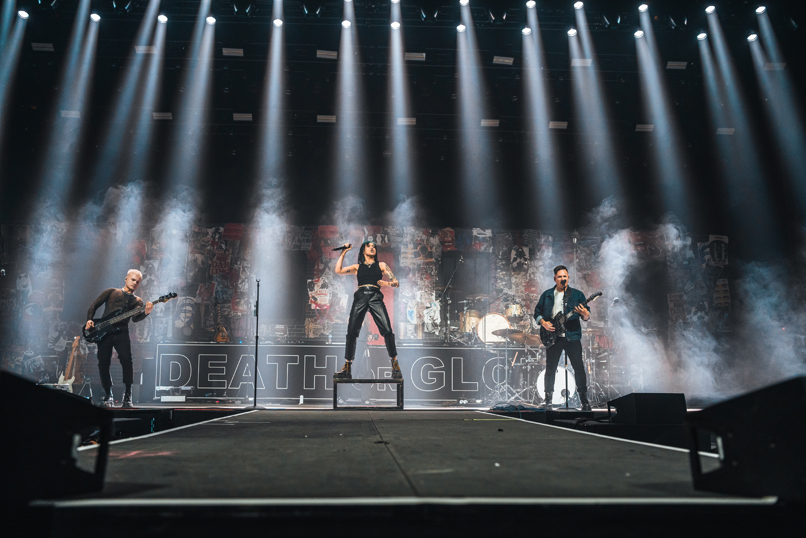 Flashing lights highlight different sections of the crowd, where excitement and suspense fill the air. The stage’s doors and windows glow through thick smoke. Bursts of what look like electrical storms flash between the stage lighting and fans’ cameras, revealing the band members taking their places on stage. The “Death or Glory” sign lights up in harsh red.