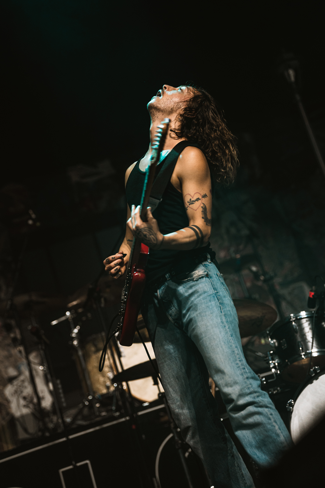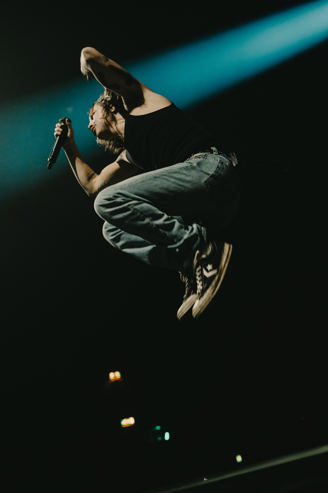They announce a “song for people who have felt stabbed in the back.” We release our anger in the mosh pit, feeling the lyrics cut deeply. A murmured bass line gives the set a heartbeat—gravelly and raw. Unique, progressive sounds emerge throughout, while buzzing noises swarm from the electric strings as the lead singer spins, holding projected notes with precision. His stage-jumping is practically an Olympic sport, each high, sporadic landing graceful and effortless. He stands atop the kick drum, belts out vocals, jumps on the guitarist’s back, and then moves to the front row to sing directly to the crowd, who hold him up as they scream the lyrics back. It’s a pure adrenaline rush for all involved, and The Hunna are clearly deserving of the crowd’s adoration.