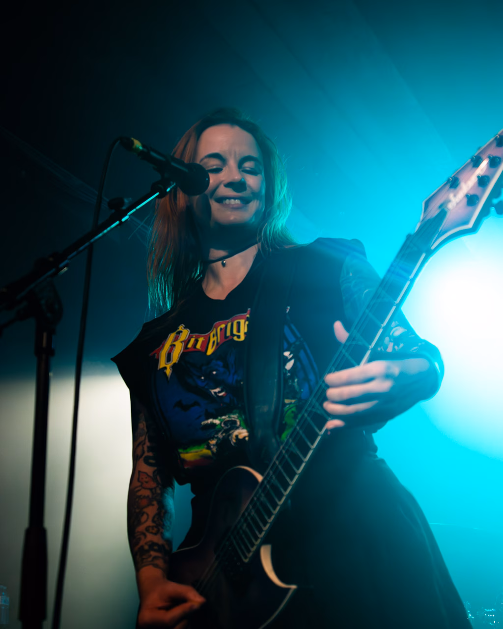 Despite this slight alteration to the expected lineup of band members, the band were still amazing to see, putting their all into their performance. The band were also selling a t-shirt displaying ‘Male Backed Metal’ across the back, which pokes fun at the term ‘Female Fronted Metal’, which shows the band’s humour and felt even more appropriate for this night, considering all of the bands were male-backed/female-fronted.