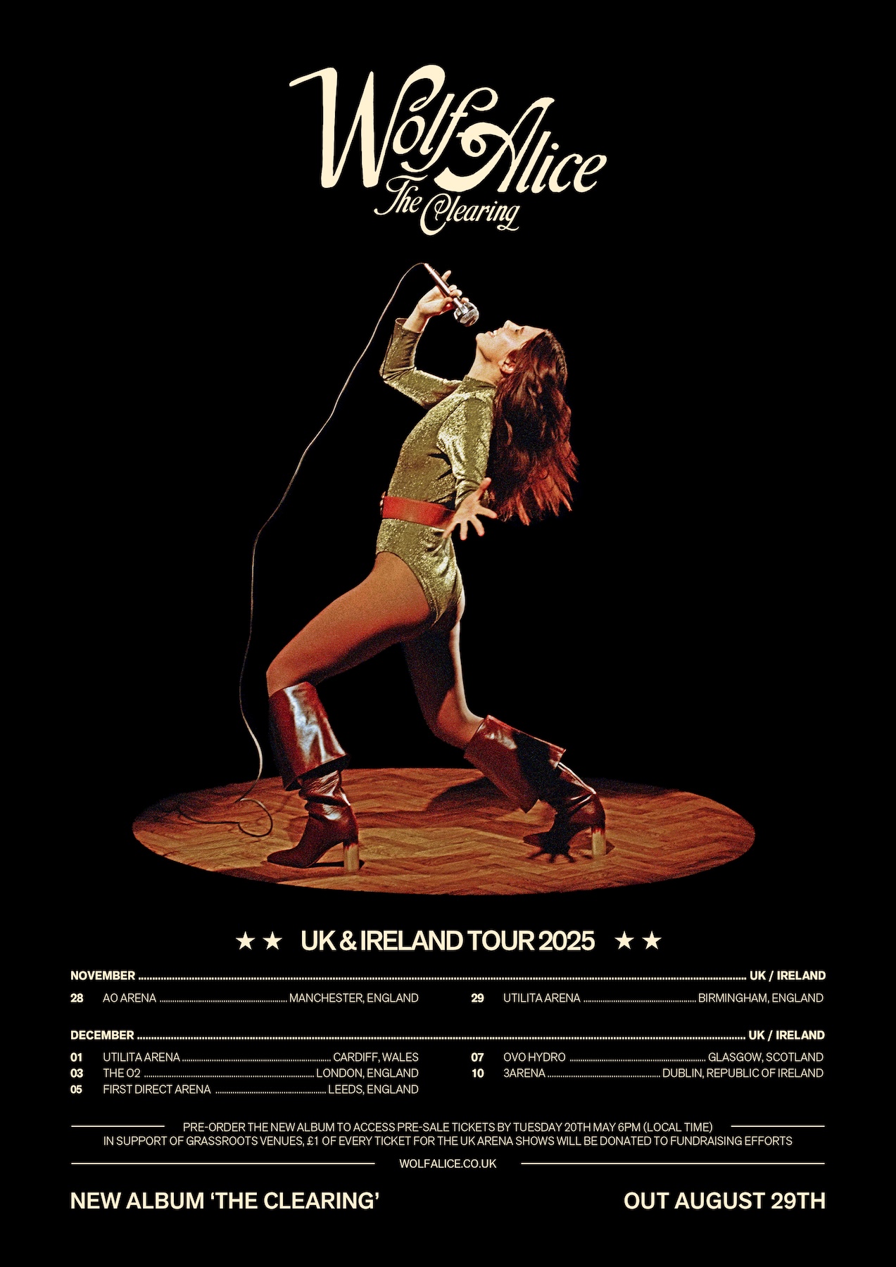 British alt-rock icons Wolf Alice have announced an extensive headline tour to support their upcoming fourth studio album, The Clearing, set for release on 29 August 2025. Spanning 43 dates, this will be their biggest tour to date, taking them across North America, Europe, and the UK. Ahead of the tour, the band will appear at BBC Radio 1’s Big Weekend on 24 May and Glastonbury Festival on 29 June.